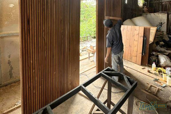 @tamtocdai Gia công cửa khung thép có gắn lam gỗ che nắng #lamgonhua #lamchenang #cuatruotgap...